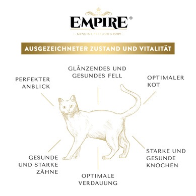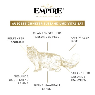 Hervorragender Geschmack - Sie müssen niemanden von der Bedeutung des Geschmacks und dem Anblick eines Haustieres überzeugen, das eifrig frisst. Empire-Produkte gewinnen in allen sogenannten "Blind" Tests auf die Schmackhaftigkeit von Lebensmitteln.Hohe Verträglich- und Verdaulichkeit - Der Verdaulichkeitsfaktor in EMPIRE-Futtermitteln liegt bei über 90% und bleibt ein Qualitätsindikator auf dem ULTRA PREMIUM-Futtermittelmarkt. Weisst Du, was das praktisch bedeutet? Nun, nicht mehr als die Tatsache, dass 90% der verzehrten Lebensmittel der wahre Nährwert sind! 86% tierischer Proteingehalt - dies ist einer der höchsten, auf dem Markt, erhältlichen Lebensmittelwerte
