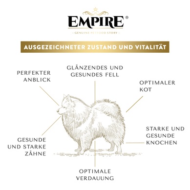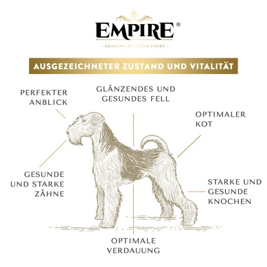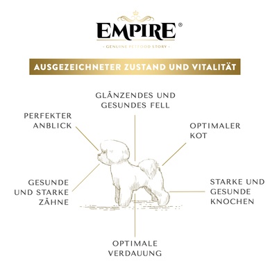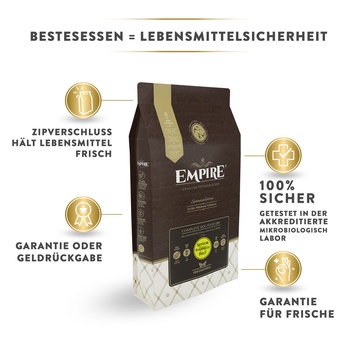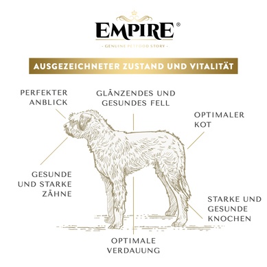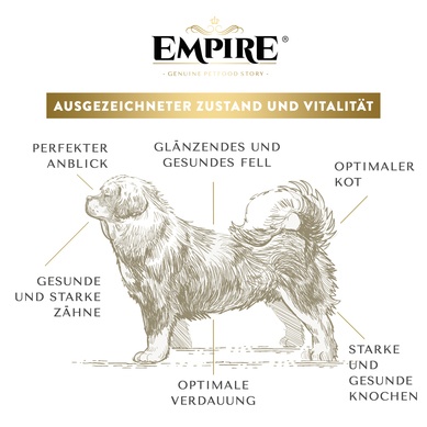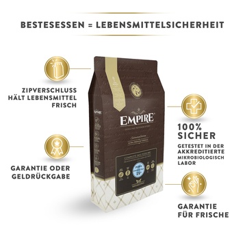 Hervorragender Geschmack - Sie müssen niemanden von der Bedeutung des Geschmacks und dem Anblick eines Haustieres überzeugen, das eifrig frisst. Empire-Produkte gewinnen in allen sogenannten "Blind" Tests auf die Schmackhaftigkeit von Lebensmitteln.Hohe Verträglich- und Verdaulichkeit - Der Verdaulichkeitsfaktor in EMPIRE-Futtermitteln liegt bei über 90% und bleibt ein Qualitätsindikator auf dem ULTRA PREMIUM-Futtermittelmarkt. Weisst Du, was das praktisch bedeutet? Nun, nicht mehr als die Tatsache, dass 90% der verzehrten Lebensmittel der wahre Nährwert sind!