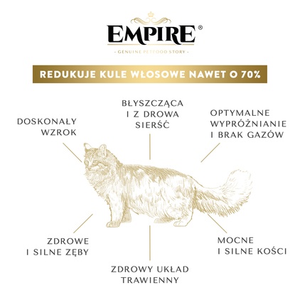 HAIRBALL CONTROL DIET to bez zbożowy, wysokomięsny i kompletny program żywieniowy dedykowany specjalnie dla długowłosych kotów. Jej holistyczna receptura klasy Ultra Premium wspomaga kondycję okrywy włosowej dzięki czemu sierść wygląda zdrowo i pięknie. Formuła ANTI HAIRBALL zawiera składniki, które wspomagają przesuwanie kłaczków wzdłuż jelit, zmniejszając tym samym dyskomfort kota. Formuła ANTI HAIRBALL zmniejsza gromadzenie się kłębków sierści nawet o 70%. Sugerujemy podawanie karmy Anti Hairball Diet zgodnie z planem żywieniowym EMPIRE od 12 miesiąca życia.