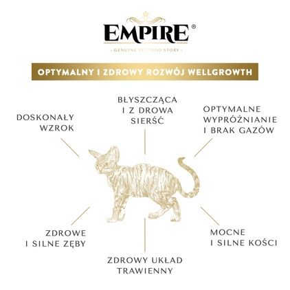 KITTEN GROWTH DIET to kompletny, bez zbożowy program żywieniowy dedykowany specjalnie dla kociąt oraz ciężarnych i karmiących kotek. KITTEN GROWTH DIET to pełnowartościowa, bez zbożowa dieta z wysoką zawartością świeżego mięsa. Nasza autorska formuła WELL GROWTH pomaga zadbać o prawidłowy rozwój kociąt w początkowym okresie wzrostu. KITTEN GROWTH DIET jest rekomendowana dla ciężarnych i karmiących kotek. Sugerujemy podawanie karmy Kitten Growth Diet zgodnie z planem żywieniowym EMPIRE do 12 miesiąca życia.